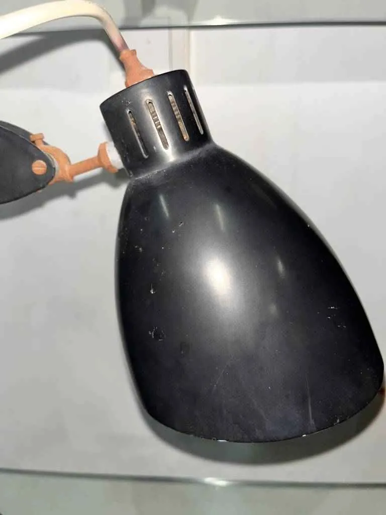 Lámpara de escritorio de estilo vintage de color negro. Se trata de una lámpara de mesa o de escritorio que tiene una base triangular con un interruptor y culmina en una pequeña tulipa. Es una lámpara ideal para colocarla en una mesa para leer o estudiar en el hogar. Como se puede observar en las fotografías la lámpara está algo desgastada por el uso, pero funciona correctamente.