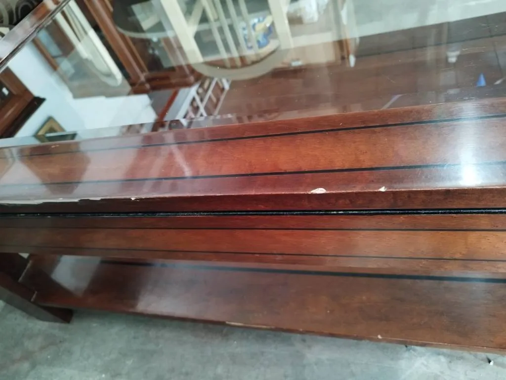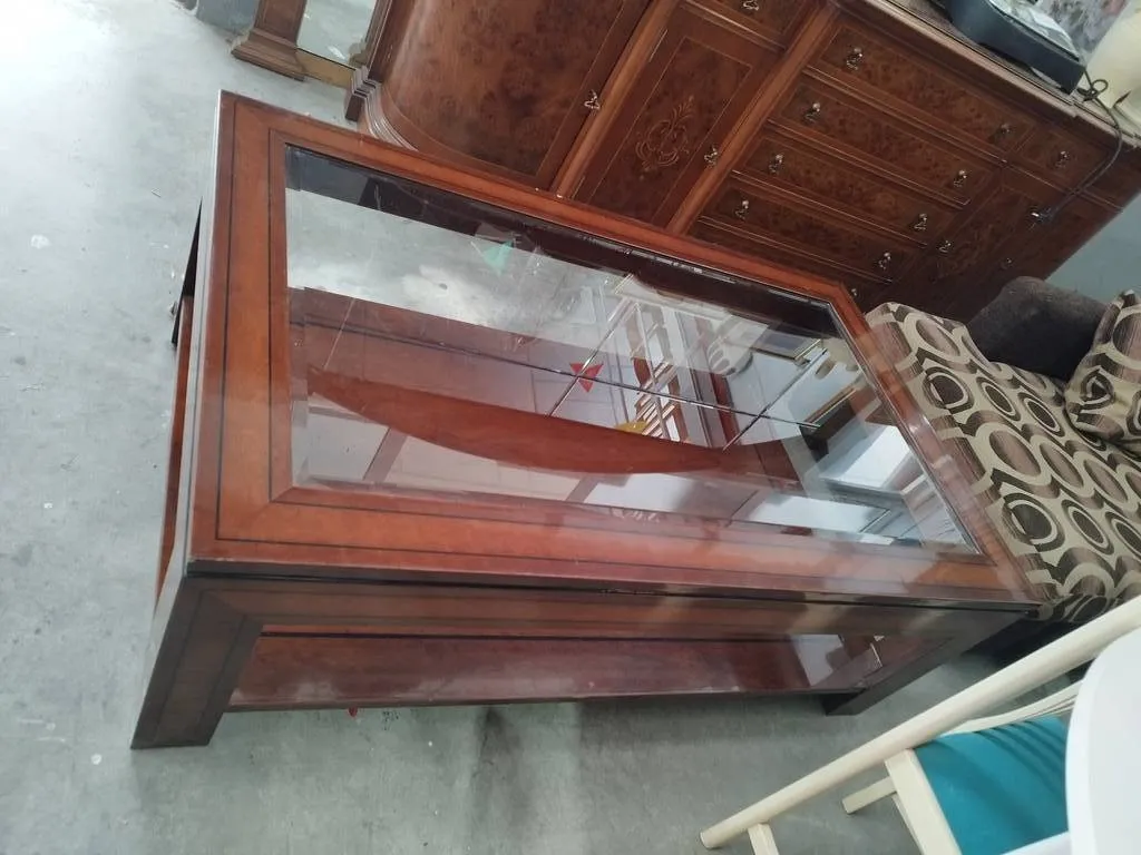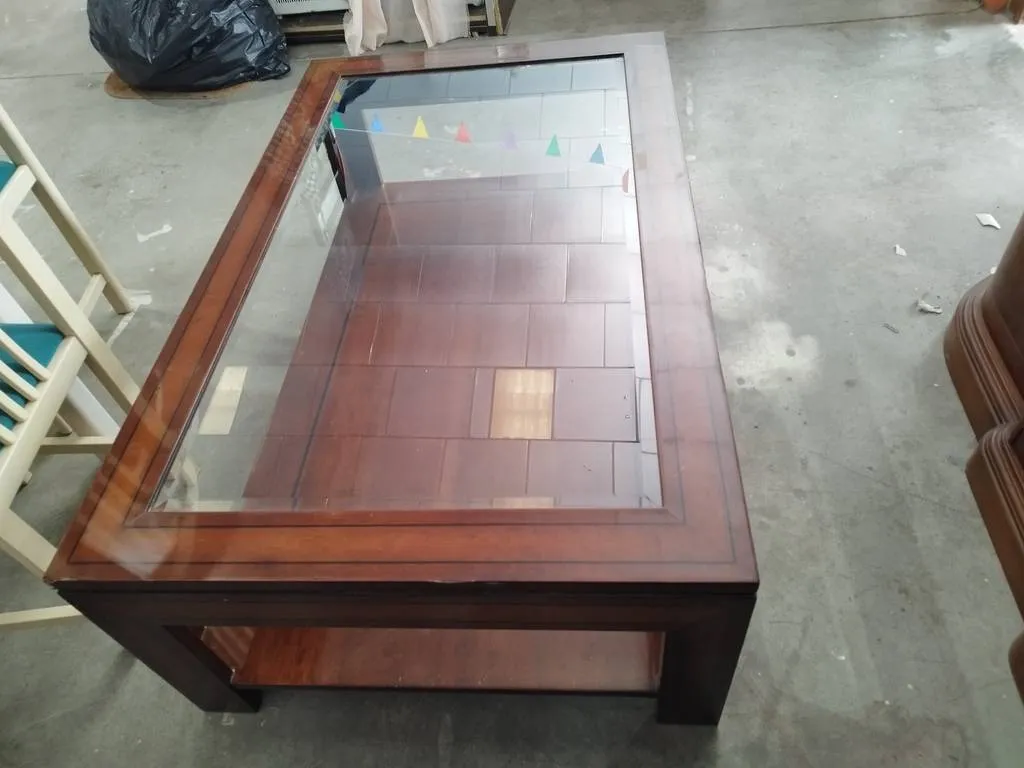 Mesa de centro de grandes dimensiones que ha sido fabricada con madera de buena calidad y robusta. Se trata de una mesa muy elegante con un cristal grueso y transparente en la parte superior y un habitáculo amplio en la inferior ideal para colocar revistas o libros. Es una mesa perfecta para colocar frente al sofá en el salón comedor. Como podemos observar en las fotografías presenta ligeros desperfectos.