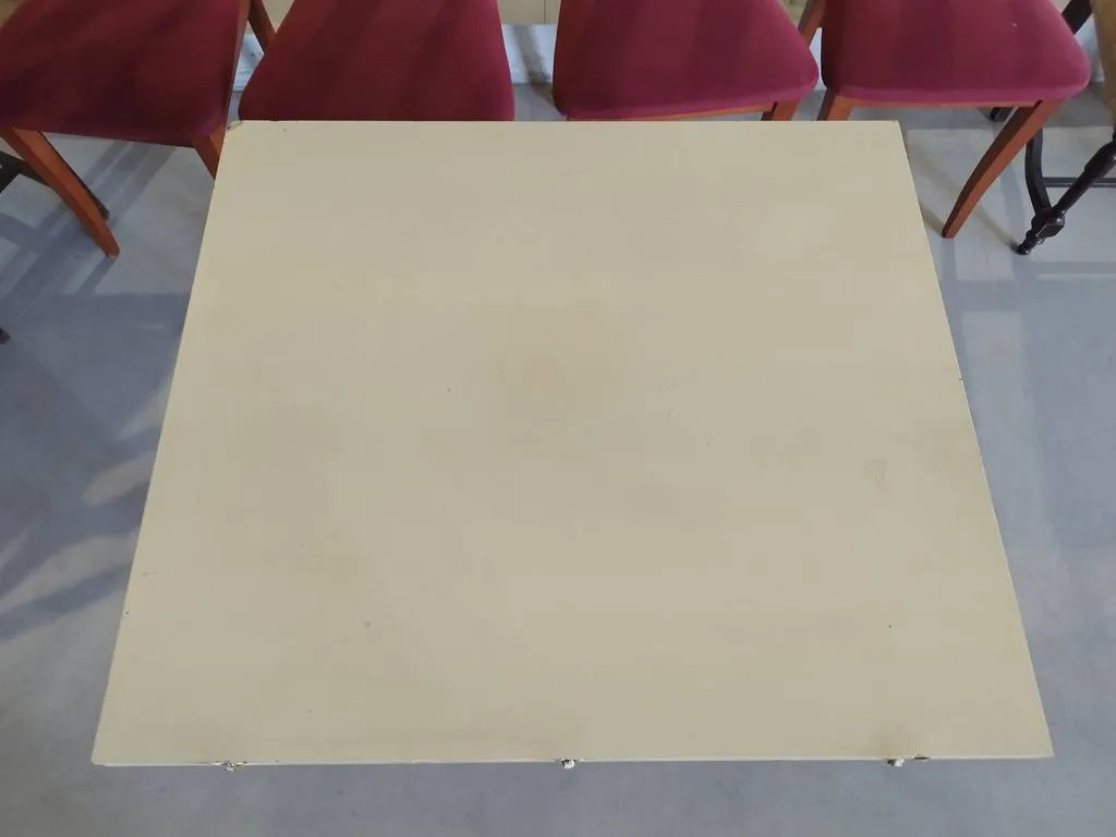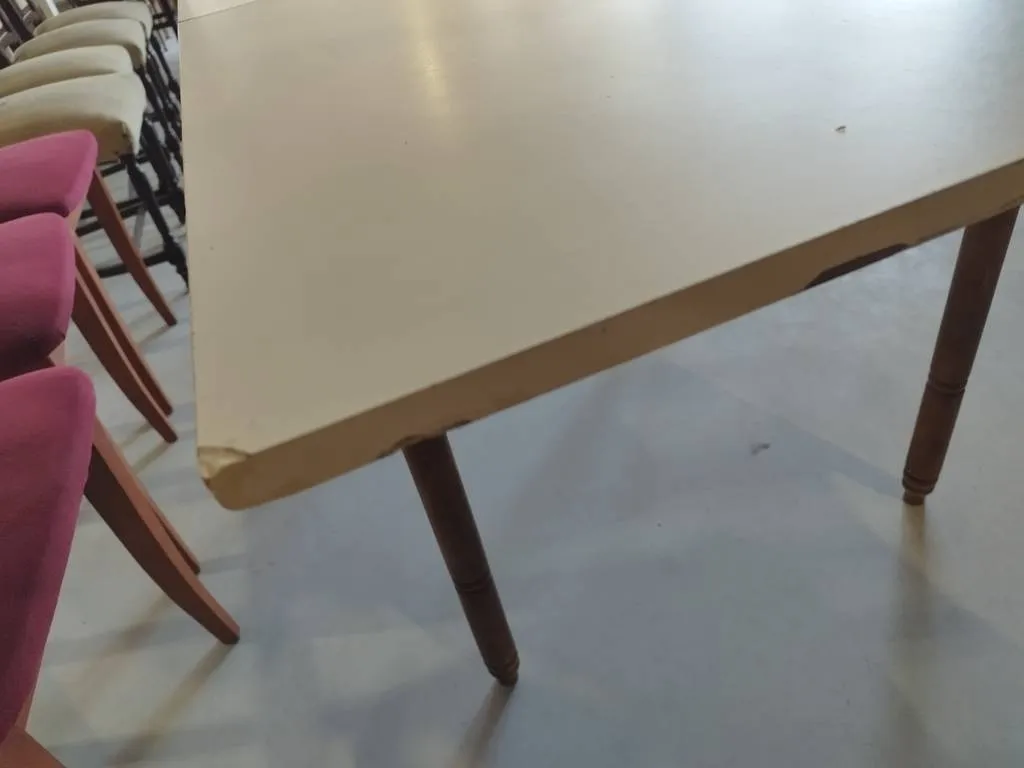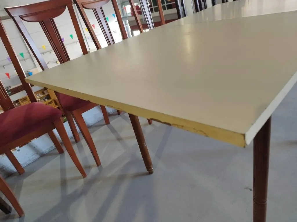 Mesa de cocina que ha sido fabricada con madera de buena calidad y robusta. Se trata de una mesa extensible gracias a su balda extra en la parte inferior. Es ideal para colocar en una cocina y no ocupa mucho espacio plegada. Sus cuatro patas la hacen una mesa muy estable Como podemos observar en las fotografías presenta desperfectos.