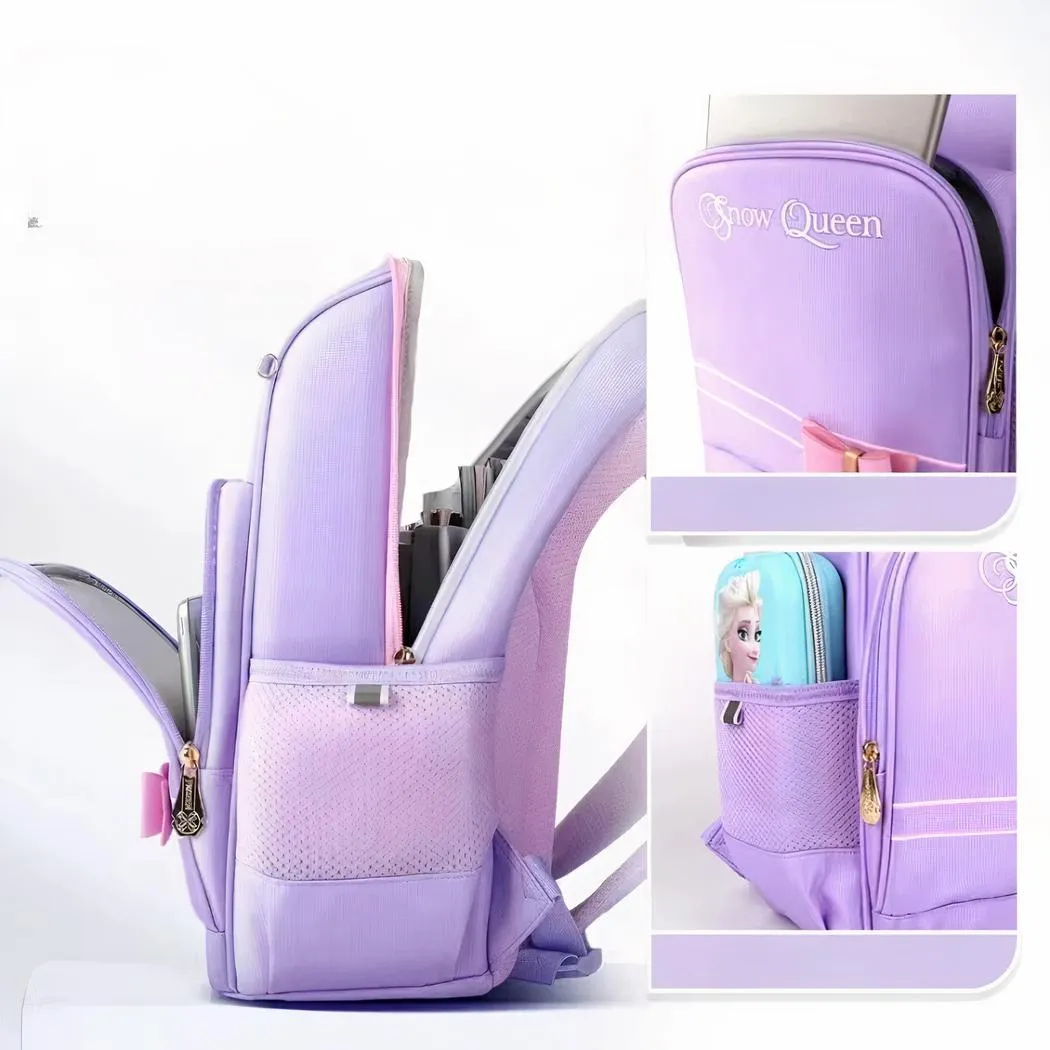 A la vez discreta y elegante, esta mochila de Frozen con lazo para niños es la elección ideal para las fans de Elsa que quieran mantener su estilo sobrio y refinado. Disponible en azul oscuro y morado, atraerá a las pequeñas escolares por su modernidad y sencillez.