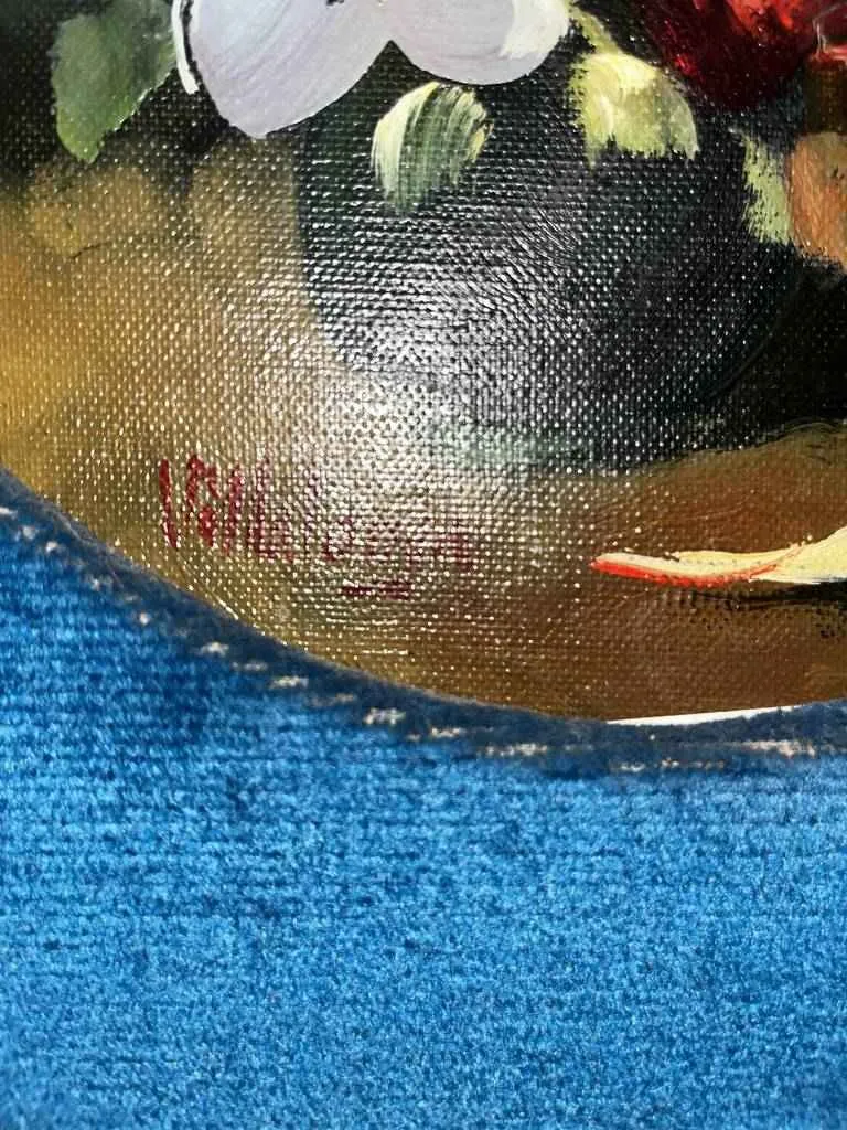 Cuadro realizado al óleo por el pintor Villalonoga en el que podemos observar un bonito jarrón repleto de múltiples flores multicolor en la parte central, esta sobre un fondo de color azul y lo enmarca un elegante marco de color dorador con bonitos detalles realizados con gran detalle. Es un cuadro ideal para exponer en nuestra casa en cualquier estancia y con ello darle un toque clásico y elegante. Como podemos observar en las fotografías se encuentra en buenas condiciones.