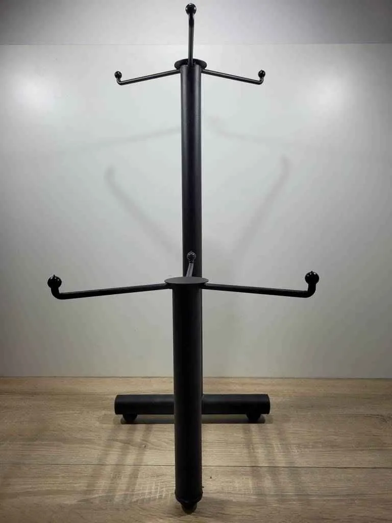 Perchero pequeño que ha sido realizado en metal y lacado en color negro que le aporta sobriedad y elegancia. Dispone de dos barras que cada una de ellas disponen de tres brazos finos para colgar todo tipo de prendas de ropa. Es ideal para colocar en un vestidor o en el recibidor de una casa. Como podemos observar en las fotografías se encuentra en buenas condiciones.