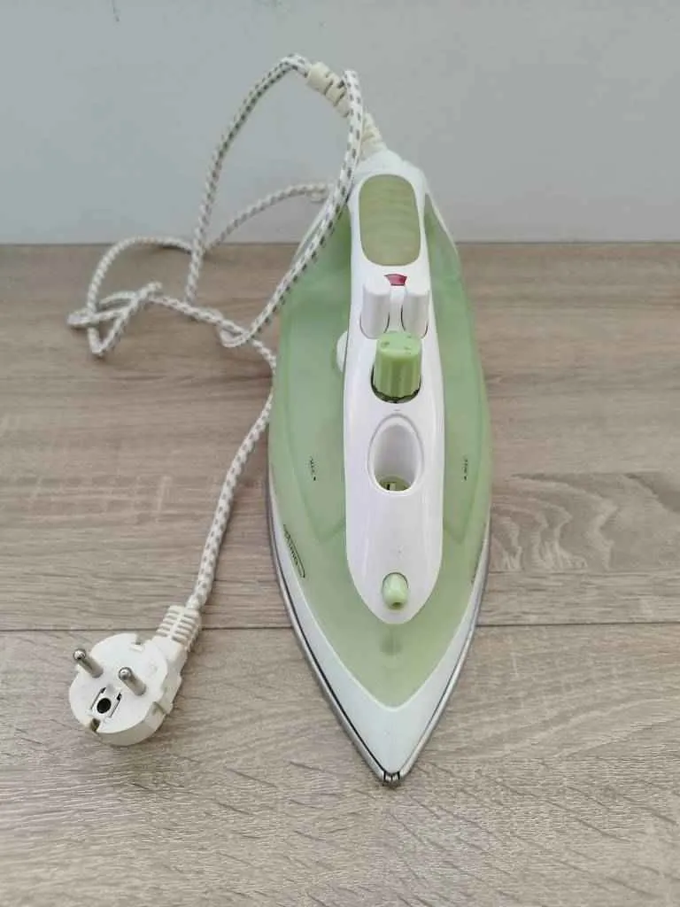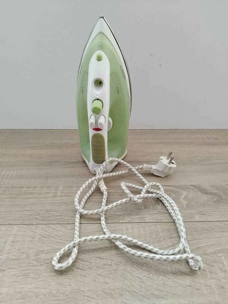 Plancha de ropa a vapor de la marca SOLAC en un bonito color blanco y verde. Tiene una potencia máxima de 1800w. Dispone de botones en la parte superior para expulsar vapor y también de una ruleta para controlar la potencia. Se trata de una plancha que funciona correctamente y está en buen estado aunque le falta la tapa donde se agrega el agua.