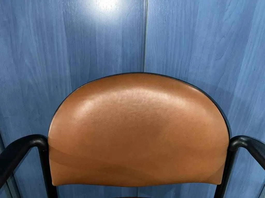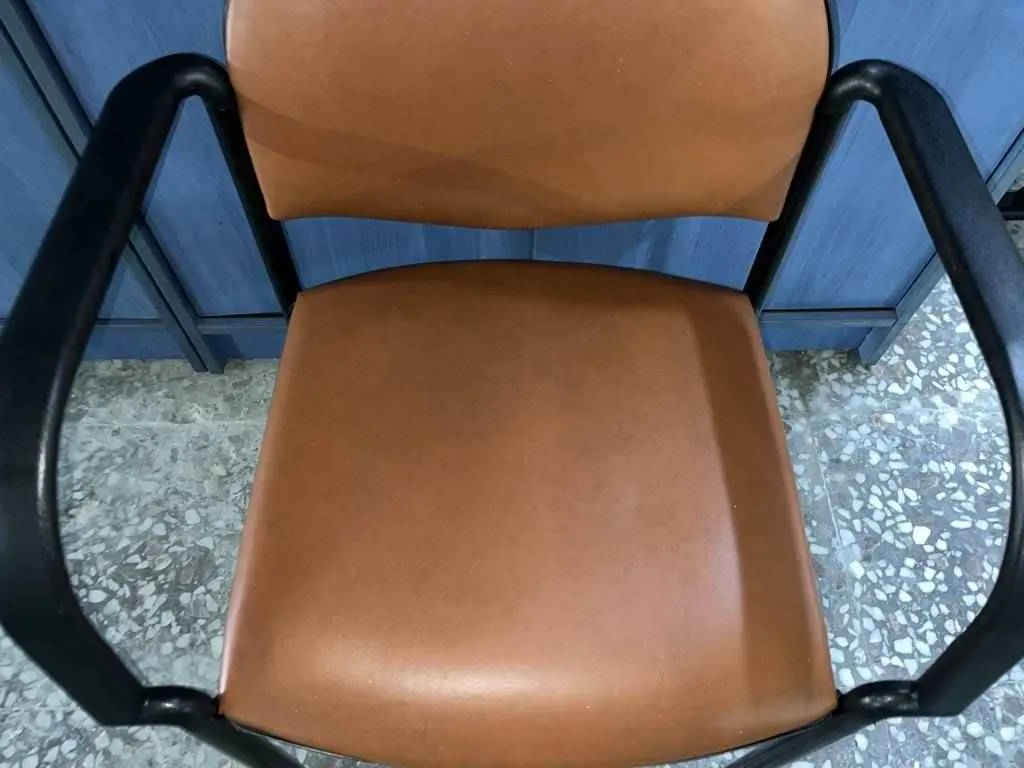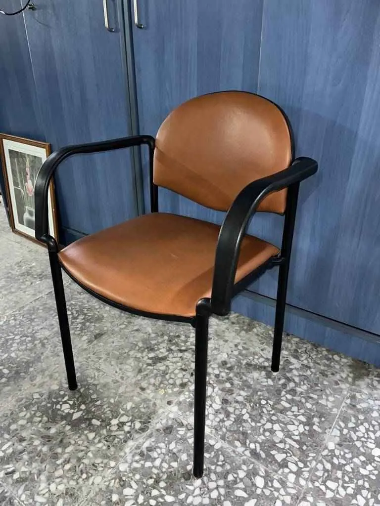 Silla de estilo clásico para oficina. La estructura principal la tiene hecha de metal robusta color negro y, además, dispone de reposabrazos en los laterales que la hacen muy cómoda. La parte del asiento y el respaldo es acolchada color marrón. Se trata de una silla muy cómoda y bien cuidada, ideal para colocar en oficinas o también en salas de espera.