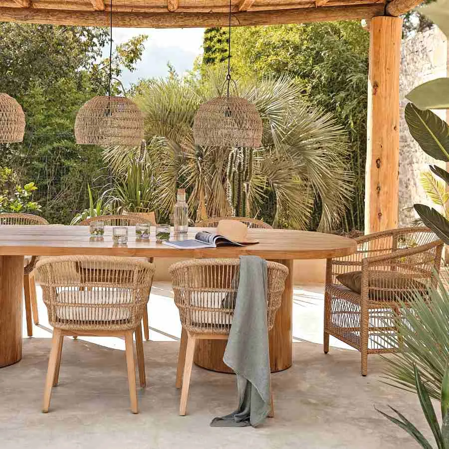 Sillón para el exterior de aire boho y toque étnico fabricado con resina efecto ratán.