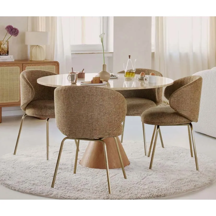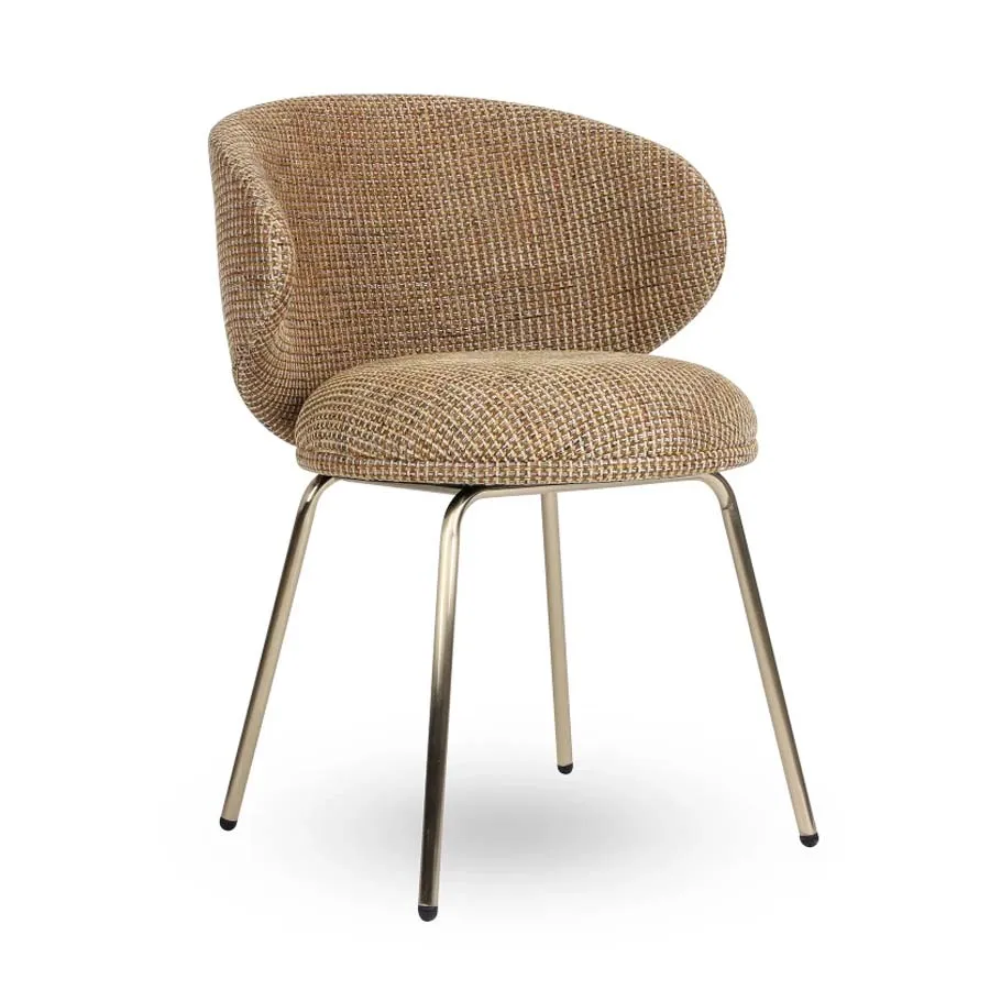 Elegante y confortable silla con un bonito diseño, con un respaldo curvo envolvente, patas de latón cepillado y tapizada en tejido tweed amarillo Miami. Quedará perfecta tanto en tu comedor como en tu oficina o despacho.