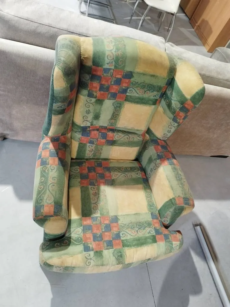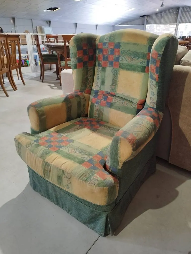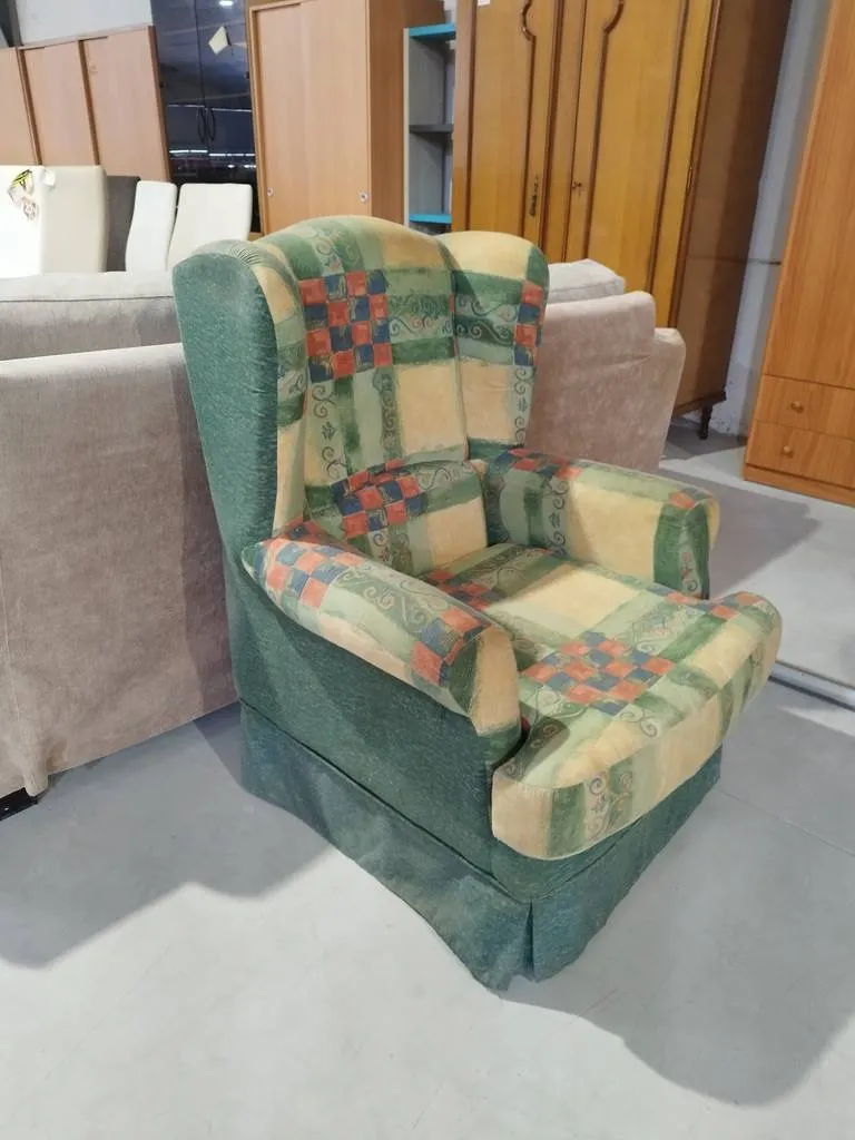 Sillón verde muy bonito con un tapizado a cuadros con múltiples colores. Se trata de un sillón que dispone de un asiento y un respaldo muy cómodo y acolchado, así como también incorpora reposabrazos en los laterales para una mayor relajación. Es ideal para colocar en un salón comedor. Como podemos observar en las fotografías se encuentra en buenas condiciones