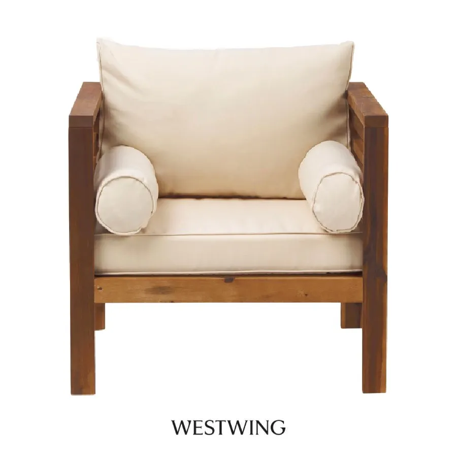 Sofá de jardín de fibras anchas de mimbre trenzadas a mano. Incluye cojines en color crudo y con revestimiento 100% poliéster, desenfundable y repelente al agua.