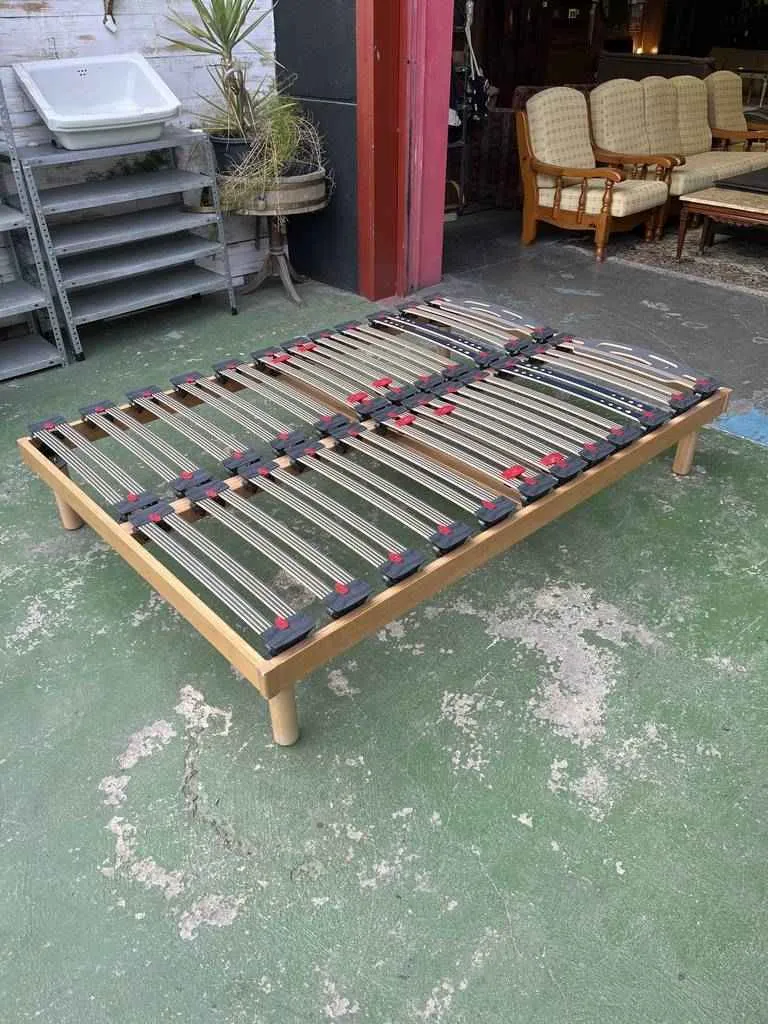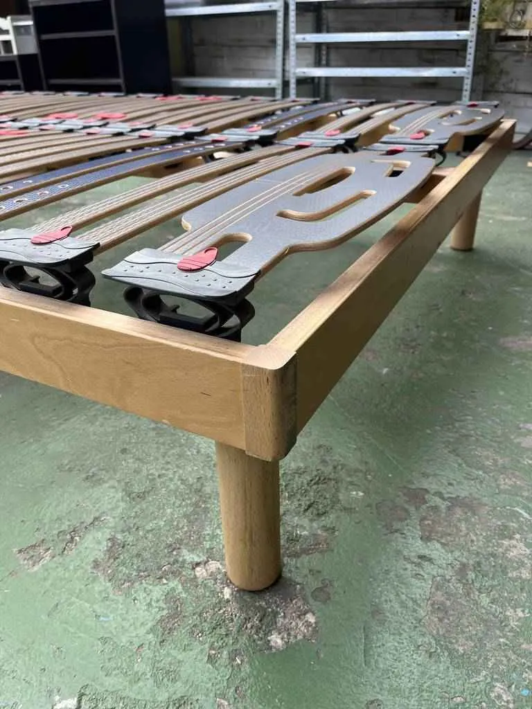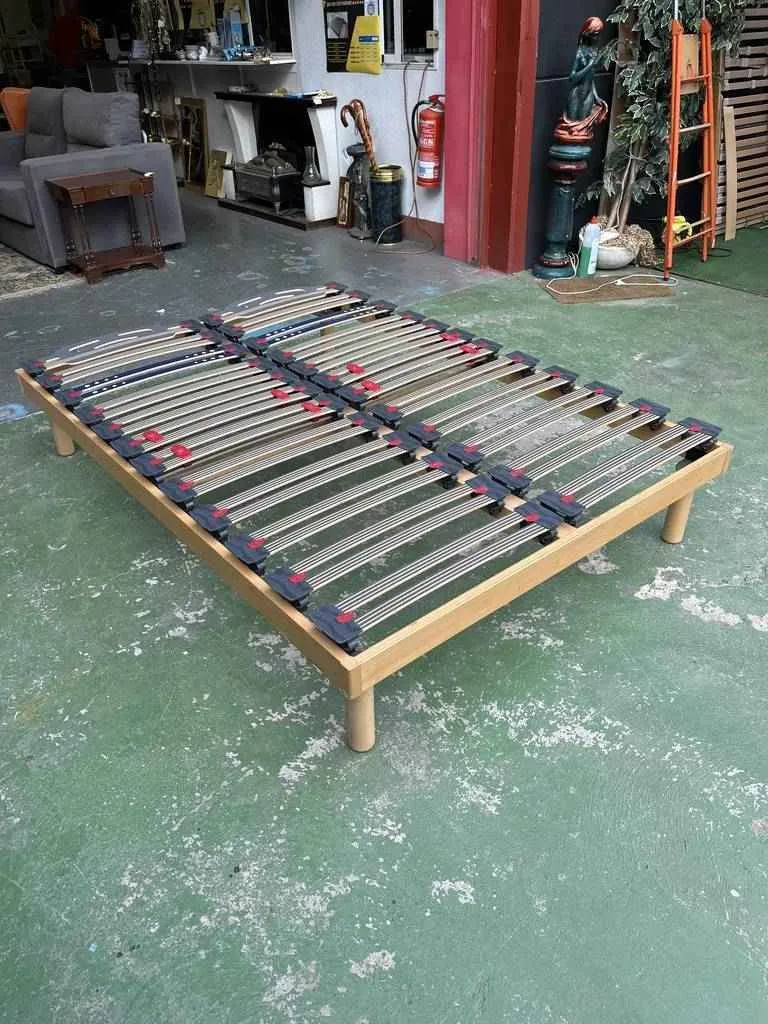 Somier de cama doble con patas. Su estructura está hecha de madera de buena calidad y robusta. Está preparado para colchones de 135x190cm o para dos colchones individuales pegados. Como podemos observar en las fotografías se encuentra bien cuidado.