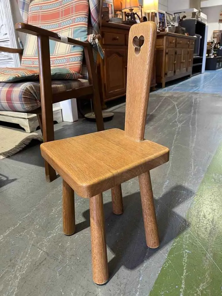 Taburete bajo de estilo vintage, hecho de madera de haya de buena calidad. Tiene un bonito y estrecho respaldo con un orificio en la parte superior muy original. También dispone de cuatro robustas patas, que lo hacen muy estable y de una gran base para sentarse cómodamente en él. Se encuentra bien cuidado como se puede ver en las imágenes.
