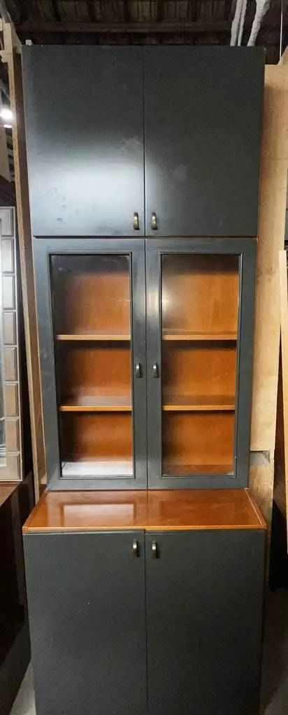 Armario vitrina de estilo moderno en un bonito color gris oscuro. Dispone de una parte superior e inferior con dos puertas cerradas, la inferior de gran capacidad. En la parte media dos puertas de cristal. Todos ellos contienen múltiples baldas donde poder colocar multitud de enseres.