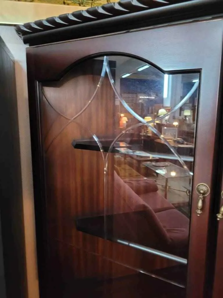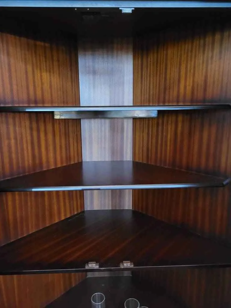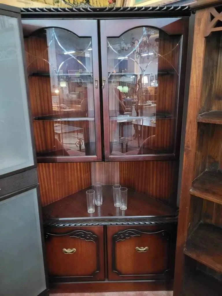 Vitrina esquinera fabricada en madera de buena calidad de color marrón. Se trata de una vitrina de estilo clásico que dispone de dos puertas en la parte inferior, una repisa en la parte central y dos puertas con cristal transparente en la parte superior. Es un mueble ideal para colocarlo en una esquina de un salón comedor porque tiene específicamente una forma que se adapta perfectamente a ella. Como se puede observar en las fotografías se encuentra en buenas condiciones.