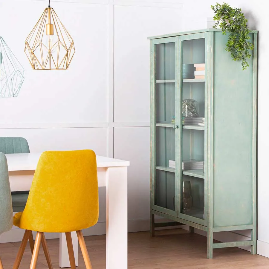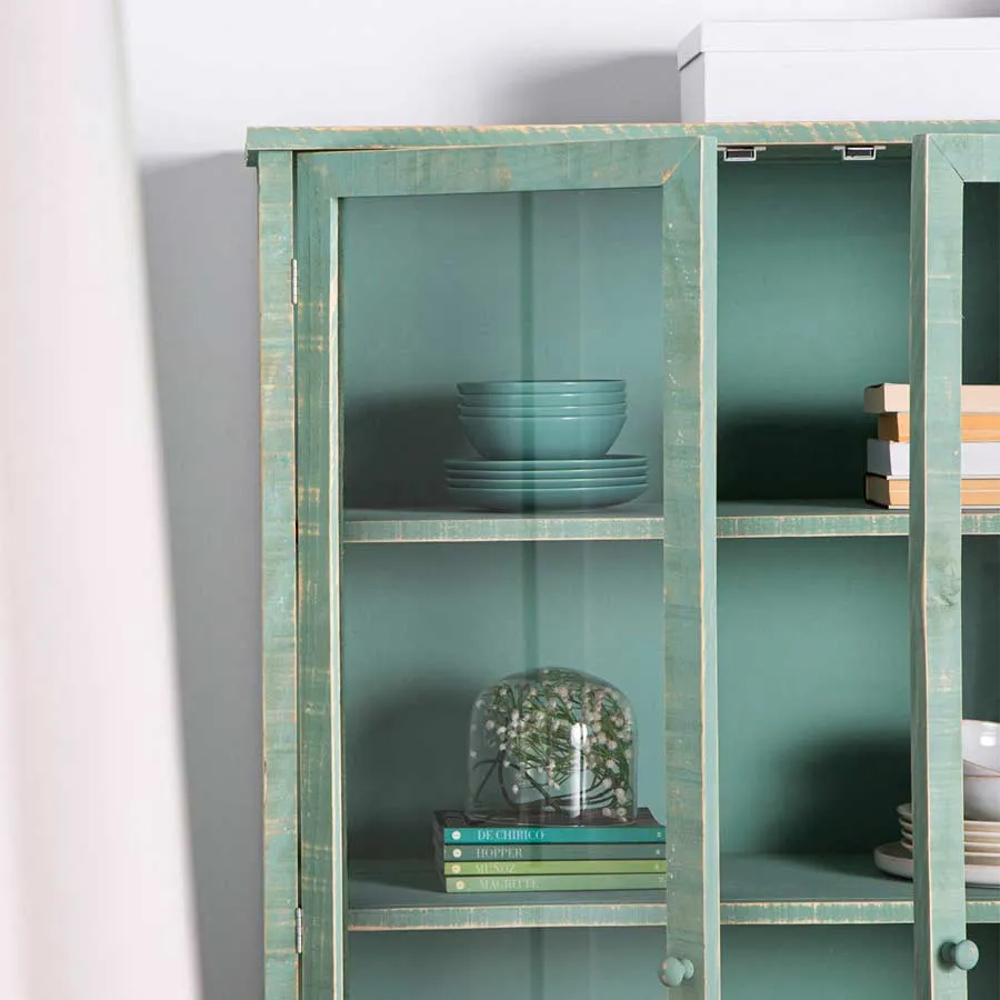 Vitrina verde con dos puertas acristaladas, fabricada de manera artesanal con madera reciclada .