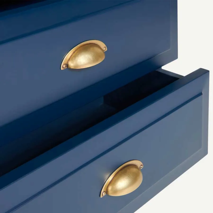 Vitrina de diseño clásico con estructura de hecha en MDF (fibra de madera prensada) de alta calidad lacado en azul, chapa de roble natural y puertas de cristal transparente.