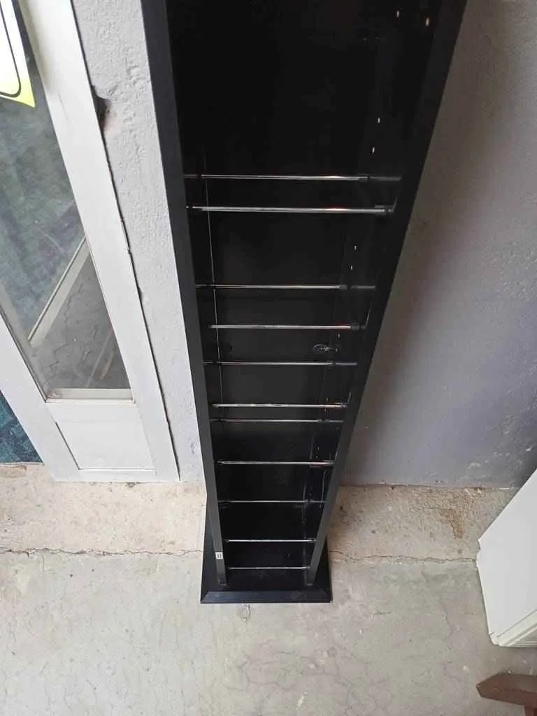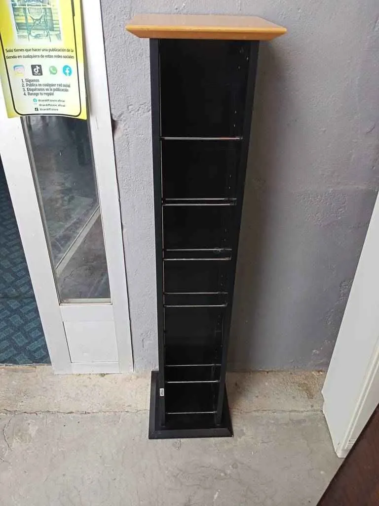 Zapatero con forma vertical de color negro y que ha sido realizada con madera de buena calidad y robusta. Dispone de finas varillas de metal para colocar nuestros zapatos cómodamente. Es ideal para colocar en un dormitorio o un vestidor. Como podemos observar en las fotografías presenta varios desperfectos pero cumple su función perfectamente.